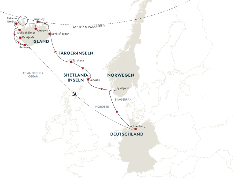 Diese Expeditions-Seereise beginnt in Hamburg und führt Sie über einige Höhepunkte Norwegens, der Shetland- und Färöer-Inseln bis zu den Naturwundern Islands, die wir bei einer spannenden Halbumrundung des „Landes aus Feuer und Eis“ entdecken.